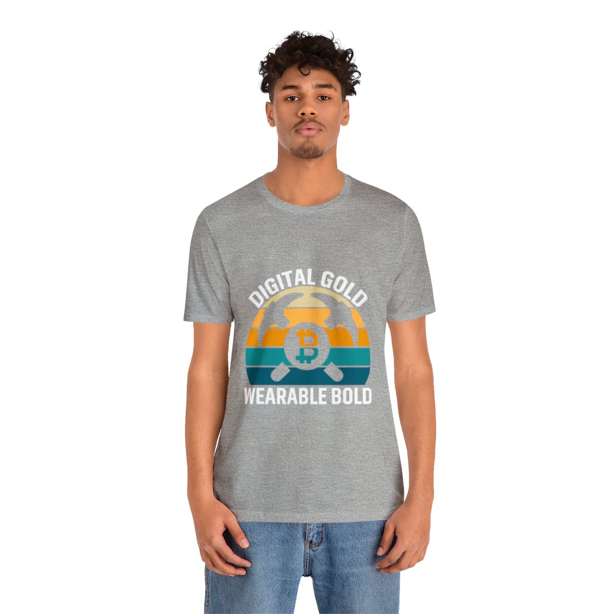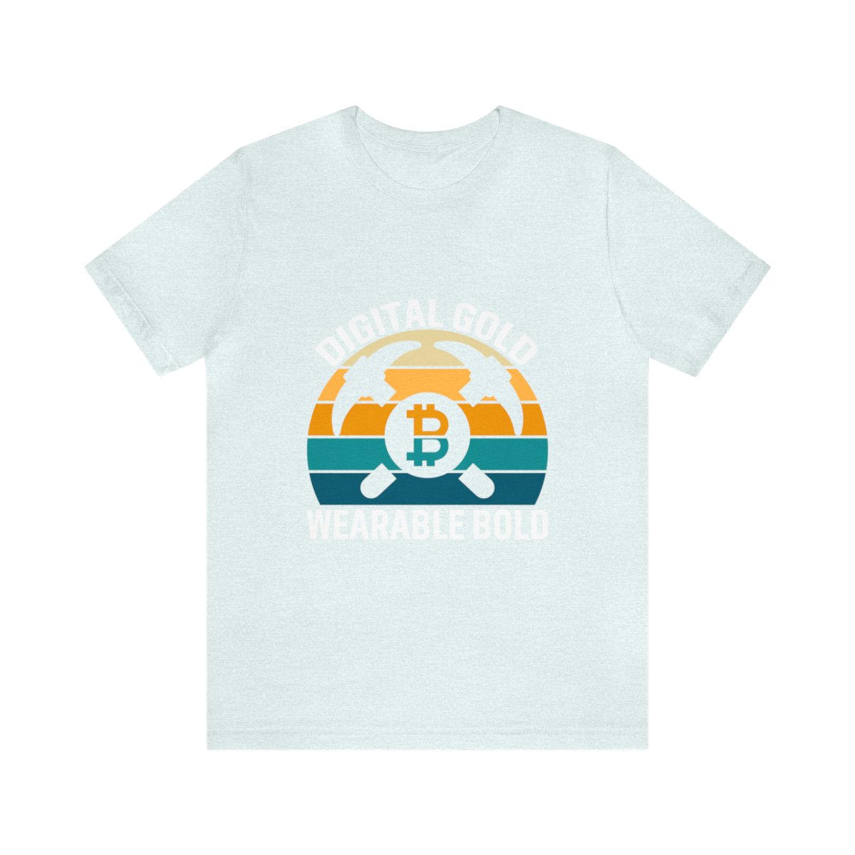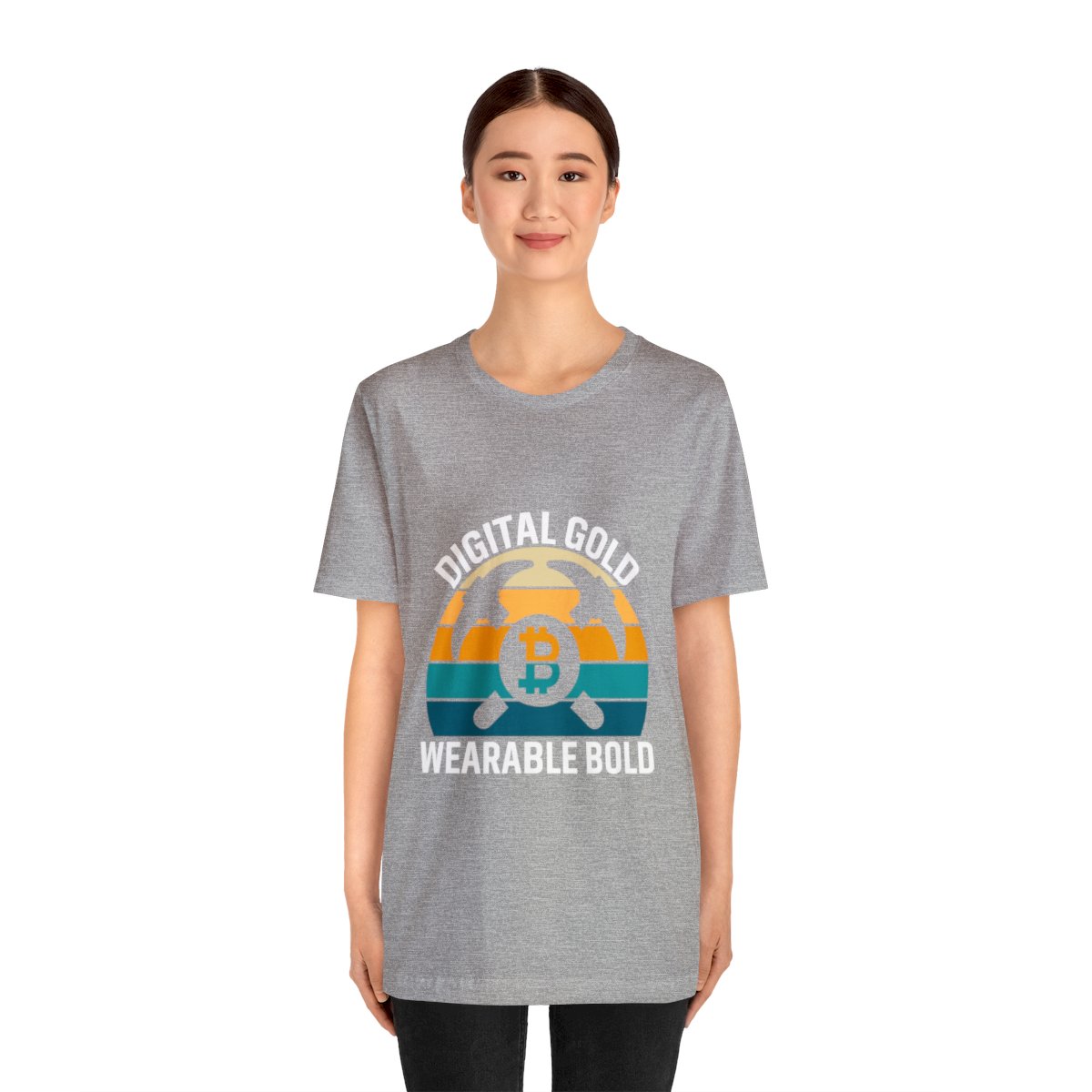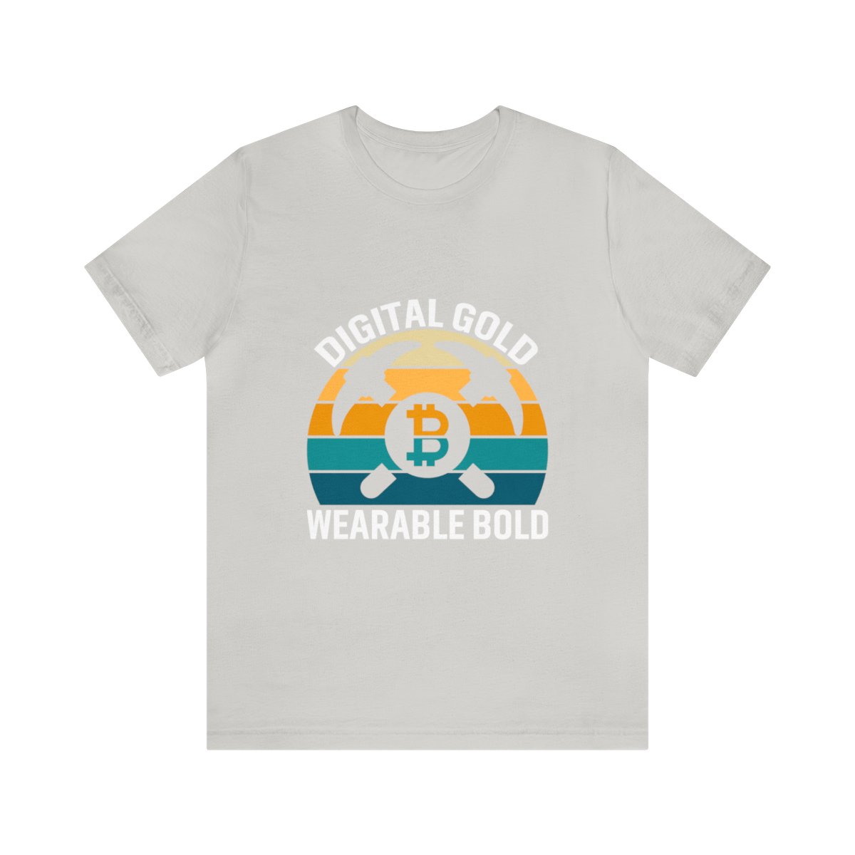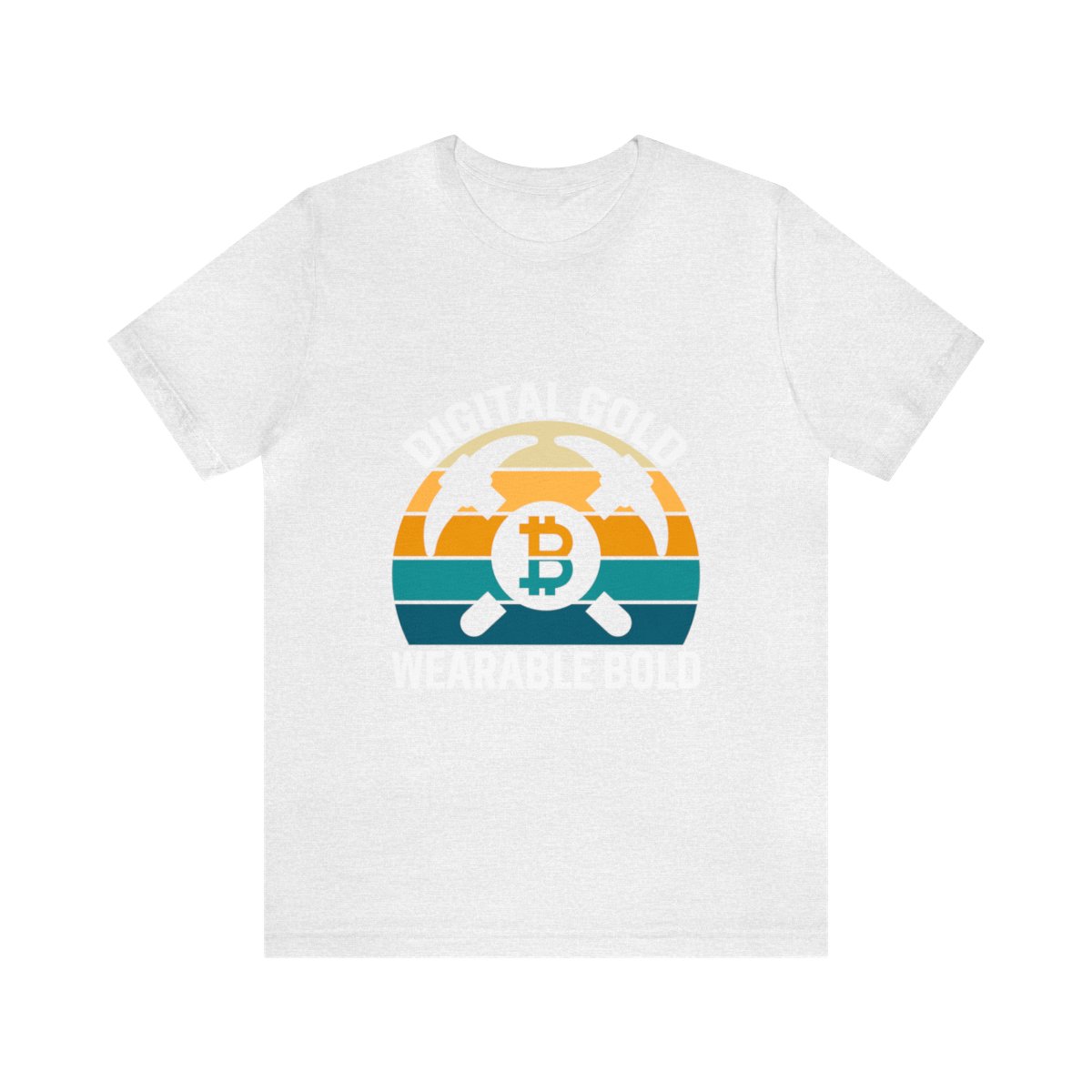 Introducing our “Digital Gold, Wearable Bold” T-shirt – a striking fusion of innovation and style that embodies the essence of cryptocurrency. This classic unisex jersey short sleeve tee isn’t just a garment; it’s a statement, a symbol of the modern era where digital meets bold. Crafted with meticulous attention to detail, this tee fits like a well-loved favorite, offering a luxurious embrace of soft cotton and a quality print that captures hearts over and over again. The ribbed knit collars contribute to shaping and durability, while the tapered shoulders ensure a fit that evolves with time. Dual side seams uphold the garment’s shape, providing enduring wear. Made with 100% Airlume combed and ring-spun cotton, the lightweight fabric (4.2 oz/yd² or 142 g/m²) is not only easy to layer but also breathable, catering to both active and leisure wear. The retail fit strikes a perfect balance for casual and semi-formal settings, complemented by a classic crew neckline that adds a touch of neat style, ideal for accessorizing. The tee proudly showcases the empowering quote “Digital Gold, Wearable Bold,” encapsulating the transformative power and confidence associated with the world of cryptocurrency. The tear-away label ensures a comfortable, irritation-free experience. With fabric blends in Ash, Heather Prism colors, Heather colors, Athletic Heather, and Black Heather, you have a diverse range to match your unique style. Step into the realm of Digital Gold, where comfort meets boldness, and every wear is a nod to the revolutionary spirit of the digital age. Redefine your wardrobe and make a bold statement with this tee – because in the world of cryptocurrency, being bold is the new gold.