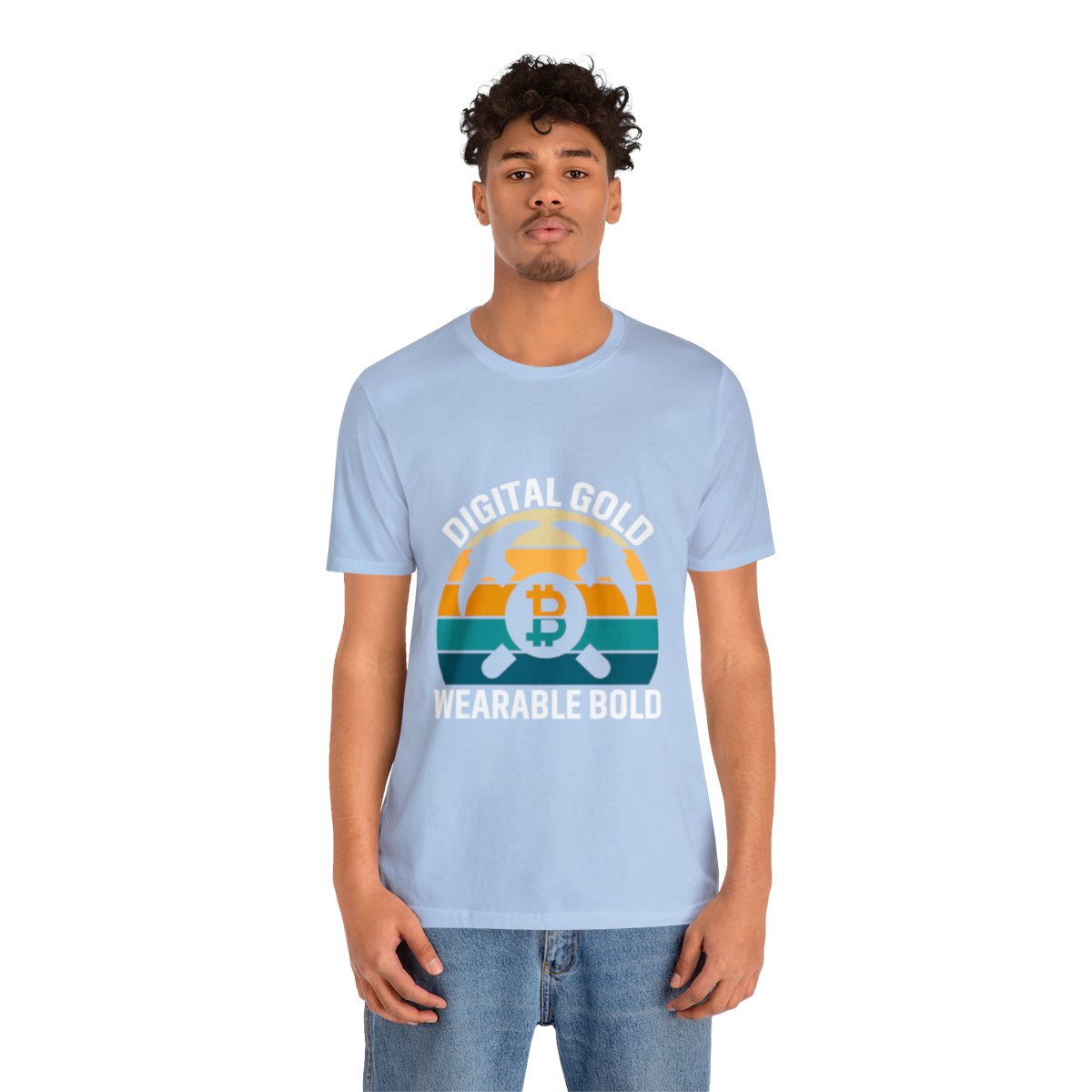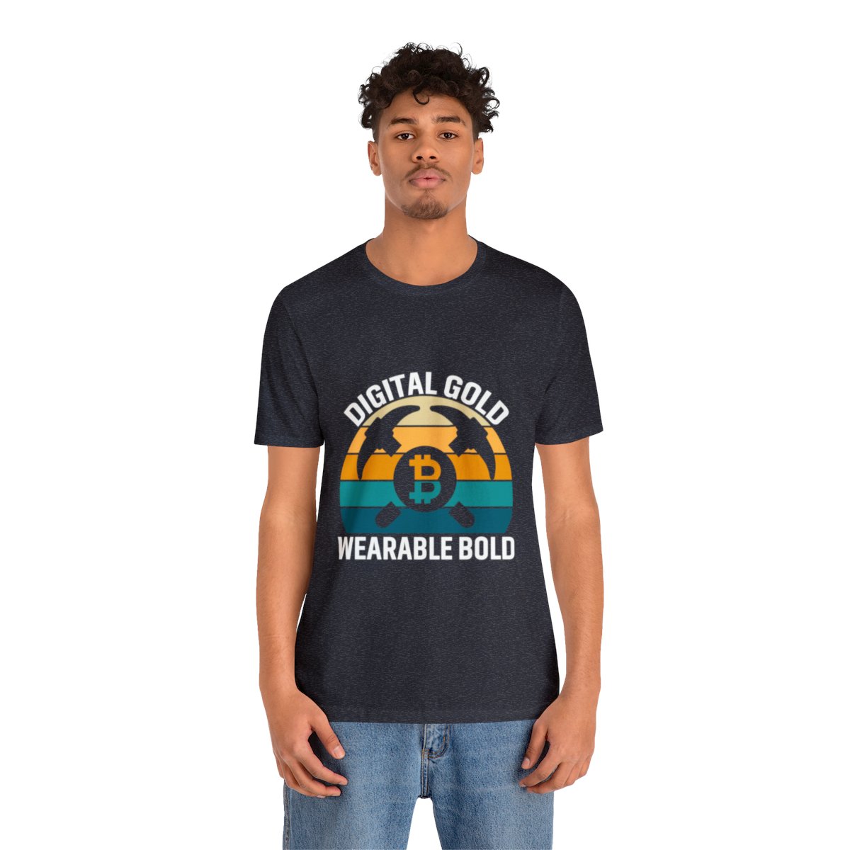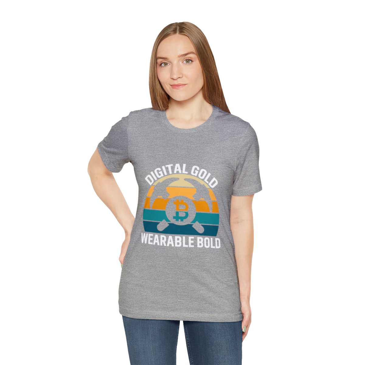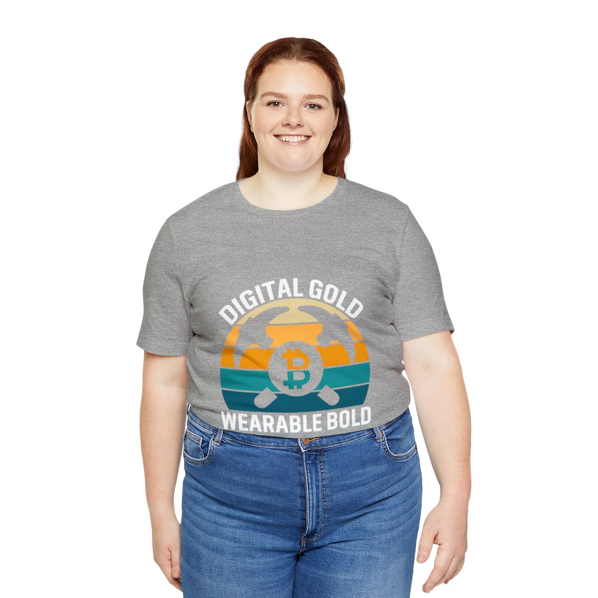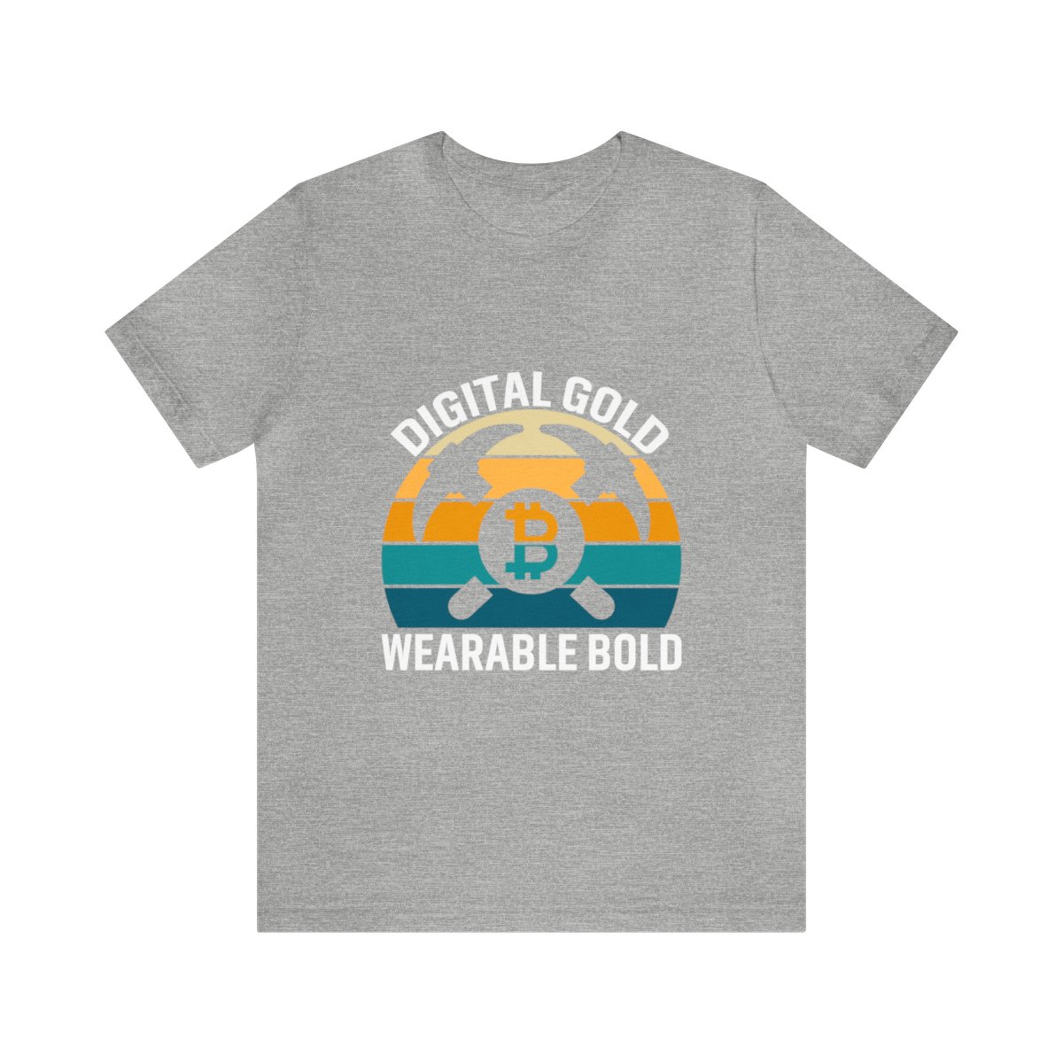 Introducing our “Digital Gold, Wearable Bold” T-shirt – a striking fusion of innovation and style that embodies the essence of cryptocurrency. This classic unisex jersey short sleeve tee isn’t just a garment; it’s a statement, a symbol of the modern era where digital meets bold. Crafted with meticulous attention to detail, this tee fits like a well-loved favorite, offering a luxurious embrace of soft cotton and a quality print that captures hearts over and over again. The ribbed knit collars contribute to shaping and durability, while the tapered shoulders ensure a fit that evolves with time. Dual side seams uphold the garment’s shape, providing enduring wear. Made with 100% Airlume combed and ring-spun cotton, the lightweight fabric (4.2 oz/yd² or 142 g/m²) is not only easy to layer but also breathable, catering to both active and leisure wear. The retail fit strikes a perfect balance for casual and semi-formal settings, complemented by a classic crew neckline that adds a touch of neat style, ideal for accessorizing. The tee proudly showcases the empowering quote “Digital Gold, Wearable Bold,” encapsulating the transformative power and confidence associated with the world of cryptocurrency. The tear-away label ensures a comfortable, irritation-free experience. With fabric blends in Ash, Heather Prism colors, Heather colors, Athletic Heather, and Black Heather, you have a diverse range to match your unique style. Step into the realm of Digital Gold, where comfort meets boldness, and every wear is a nod to the revolutionary spirit of the digital age. Redefine your wardrobe and make a bold statement with this tee – because in the world of cryptocurrency, being bold is the new gold.