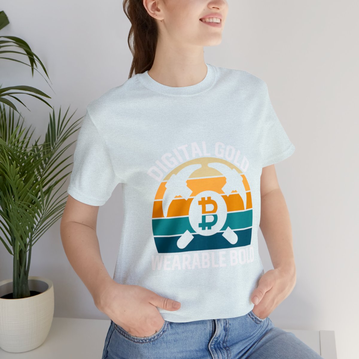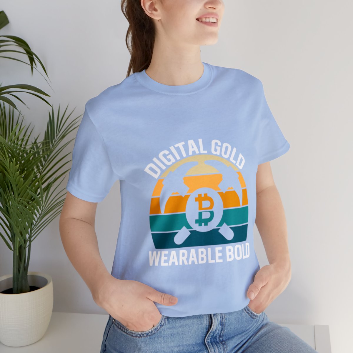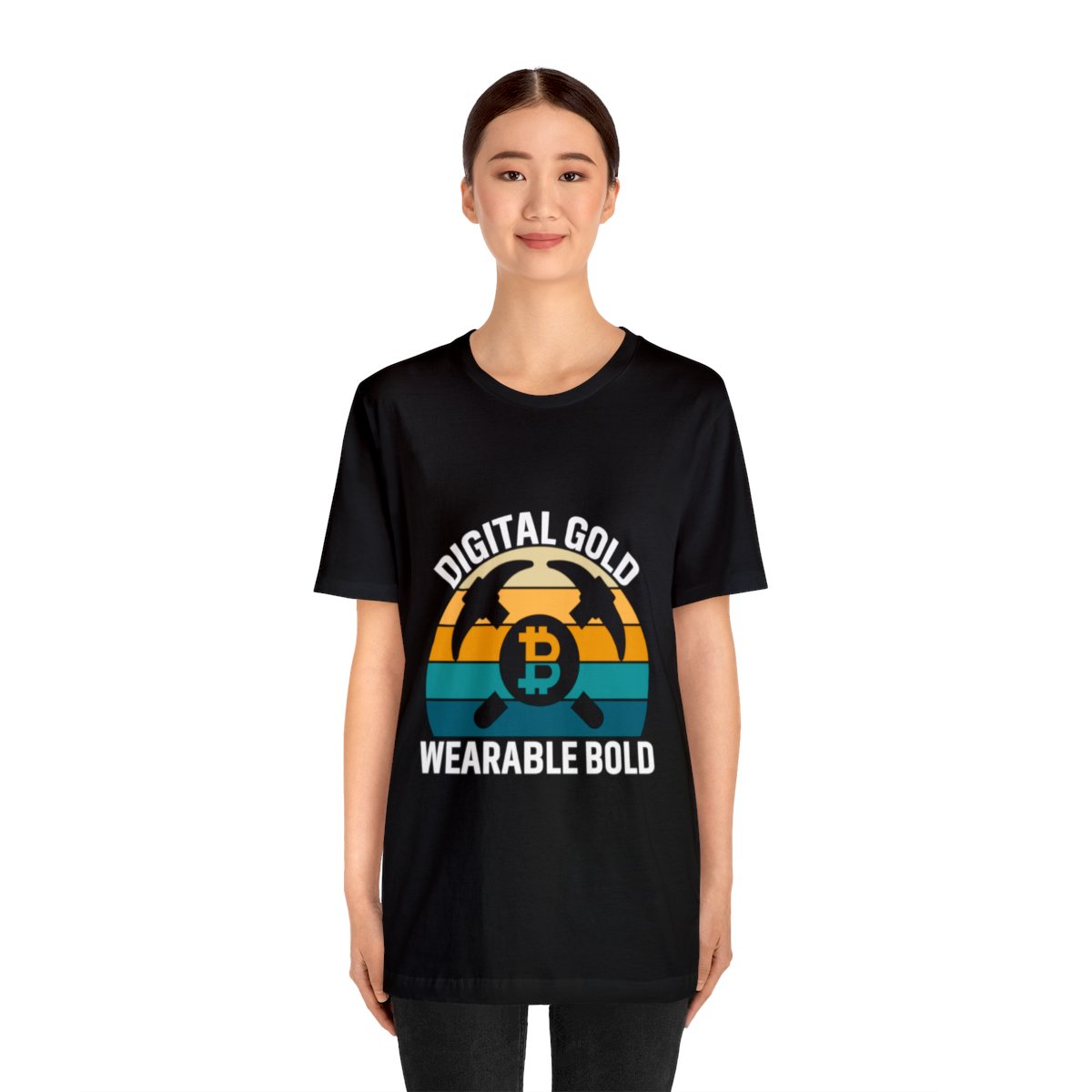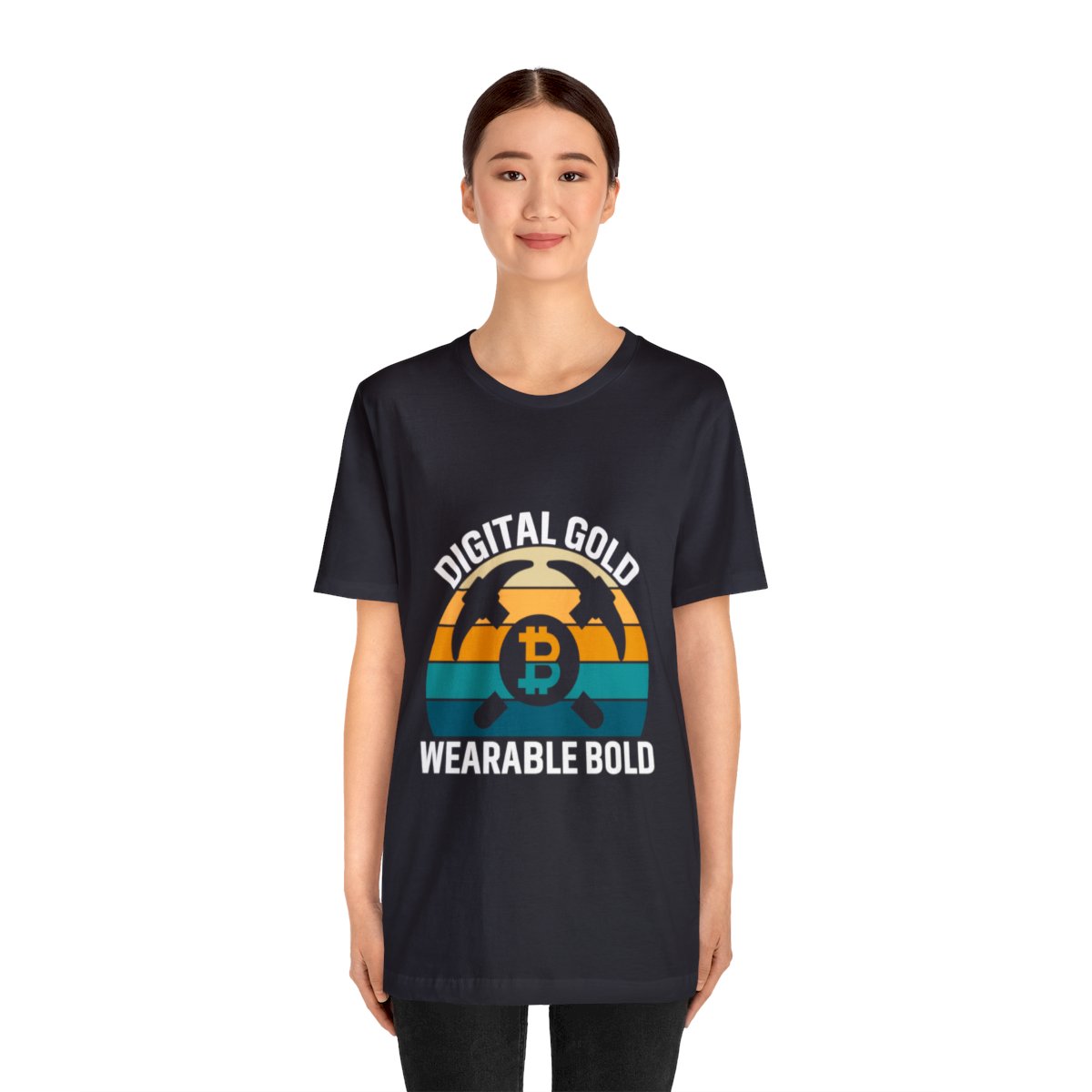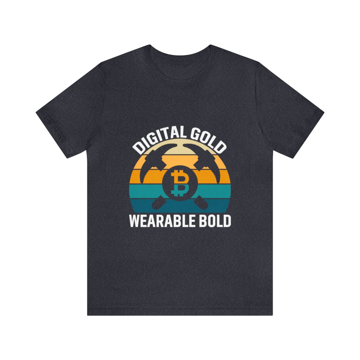 Introducing our “Digital Gold, Wearable Bold” T-shirt – a striking fusion of innovation and style that embodies the essence of cryptocurrency. This classic unisex jersey short sleeve tee isn’t just a garment; it’s a statement, a symbol of the modern era where digital meets bold. Crafted with meticulous attention to detail, this tee fits like a well-loved favorite, offering a luxurious embrace of soft cotton and a quality print that captures hearts over and over again. The ribbed knit collars contribute to shaping and durability, while the tapered shoulders ensure a fit that evolves with time. Dual side seams uphold the garment’s shape, providing enduring wear. Made with 100% Airlume combed and ring-spun cotton, the lightweight fabric (4.2 oz/yd² or 142 g/m²) is not only easy to layer but also breathable, catering to both active and leisure wear. The retail fit strikes a perfect balance for casual and semi-formal settings, complemented by a classic crew neckline that adds a touch of neat style, ideal for accessorizing. The tee proudly showcases the empowering quote “Digital Gold, Wearable Bold,” encapsulating the transformative power and confidence associated with the world of cryptocurrency. The tear-away label ensures a comfortable, irritation-free experience. With fabric blends in Ash, Heather Prism colors, Heather colors, Athletic Heather, and Black Heather, you have a diverse range to match your unique style. Step into the realm of Digital Gold, where comfort meets boldness, and every wear is a nod to the revolutionary spirit of the digital age. Redefine your wardrobe and make a bold statement with this tee – because in the world of cryptocurrency, being bold is the new gold.