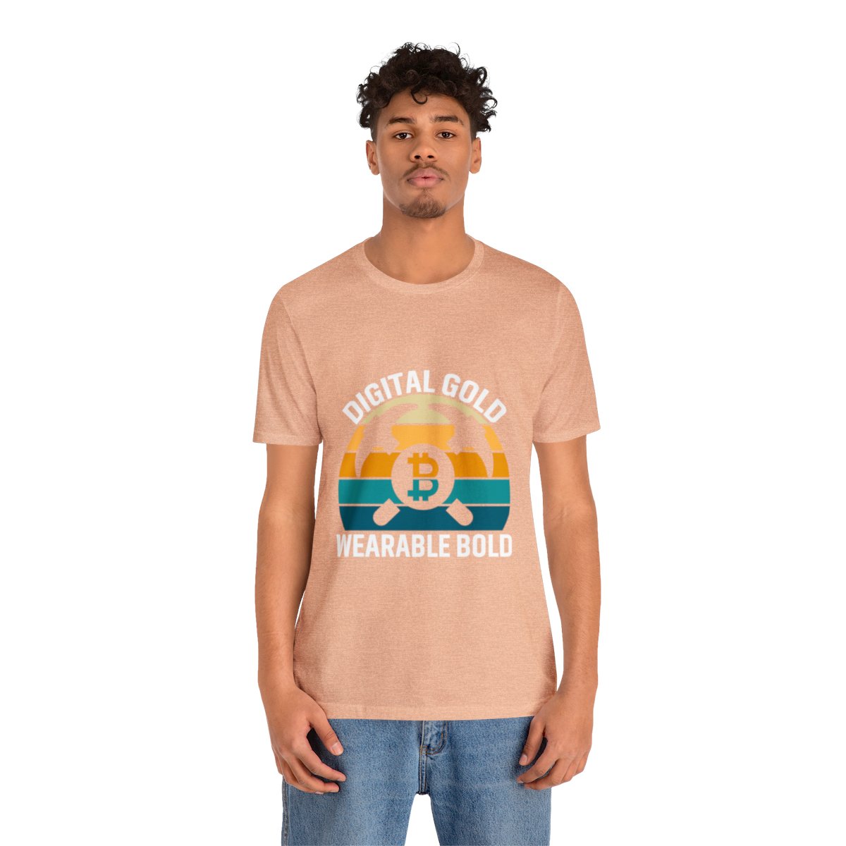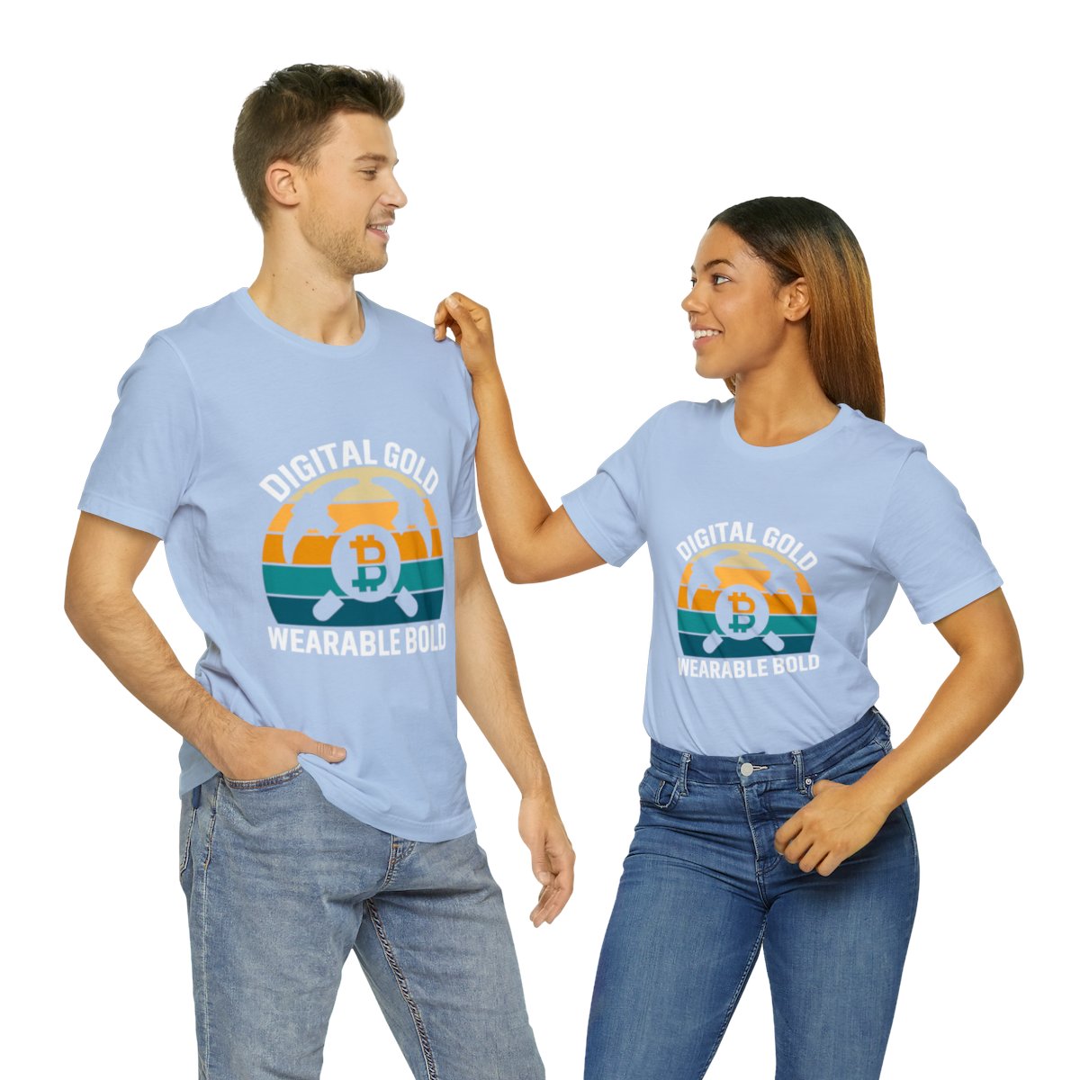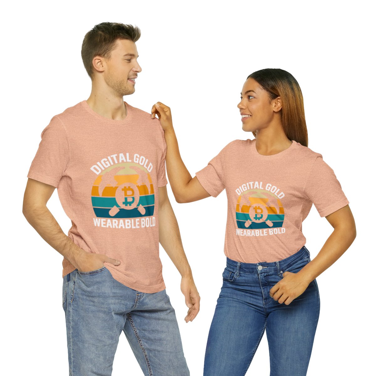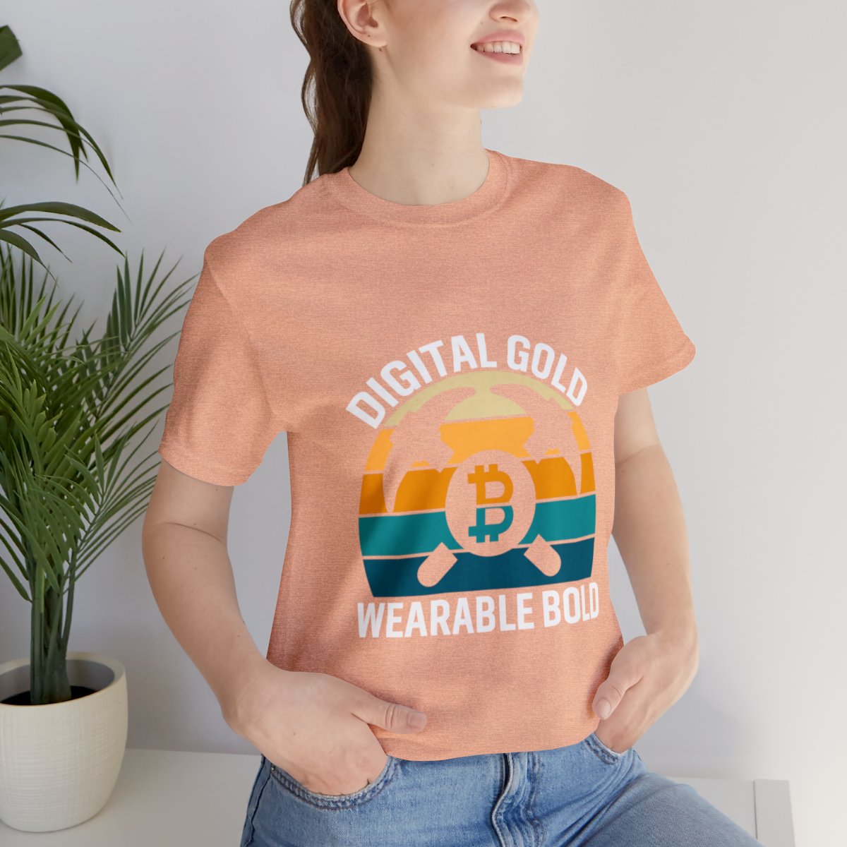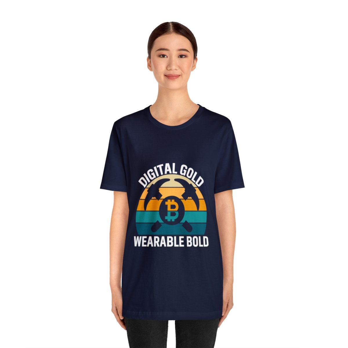 Introducing our “Digital Gold, Wearable Bold” T-shirt – a striking fusion of innovation and style that embodies the essence of cryptocurrency. This classic unisex jersey short sleeve tee isn’t just a garment; it’s a statement, a symbol of the modern era where digital meets bold. Crafted with meticulous attention to detail, this tee fits like a well-loved favorite, offering a luxurious embrace of soft cotton and a quality print that captures hearts over and over again. The ribbed knit collars contribute to shaping and durability, while the tapered shoulders ensure a fit that evolves with time. Dual side seams uphold the garment’s shape, providing enduring wear. Made with 100% Airlume combed and ring-spun cotton, the lightweight fabric (4.2 oz/yd² or 142 g/m²) is not only easy to layer but also breathable, catering to both active and leisure wear. The retail fit strikes a perfect balance for casual and semi-formal settings, complemented by a classic crew neckline that adds a touch of neat style, ideal for accessorizing. The tee proudly showcases the empowering quote “Digital Gold, Wearable Bold,” encapsulating the transformative power and confidence associated with the world of cryptocurrency. The tear-away label ensures a comfortable, irritation-free experience. With fabric blends in Ash, Heather Prism colors, Heather colors, Athletic Heather, and Black Heather, you have a diverse range to match your unique style. Step into the realm of Digital Gold, where comfort meets boldness, and every wear is a nod to the revolutionary spirit of the digital age. Redefine your wardrobe and make a bold statement with this tee – because in the world of cryptocurrency, being bold is the new gold.
