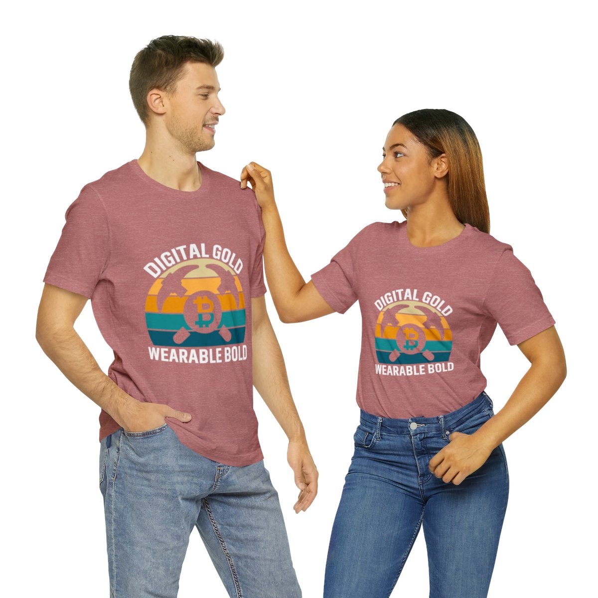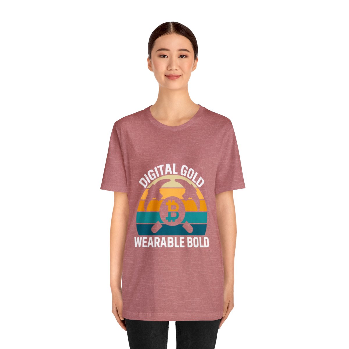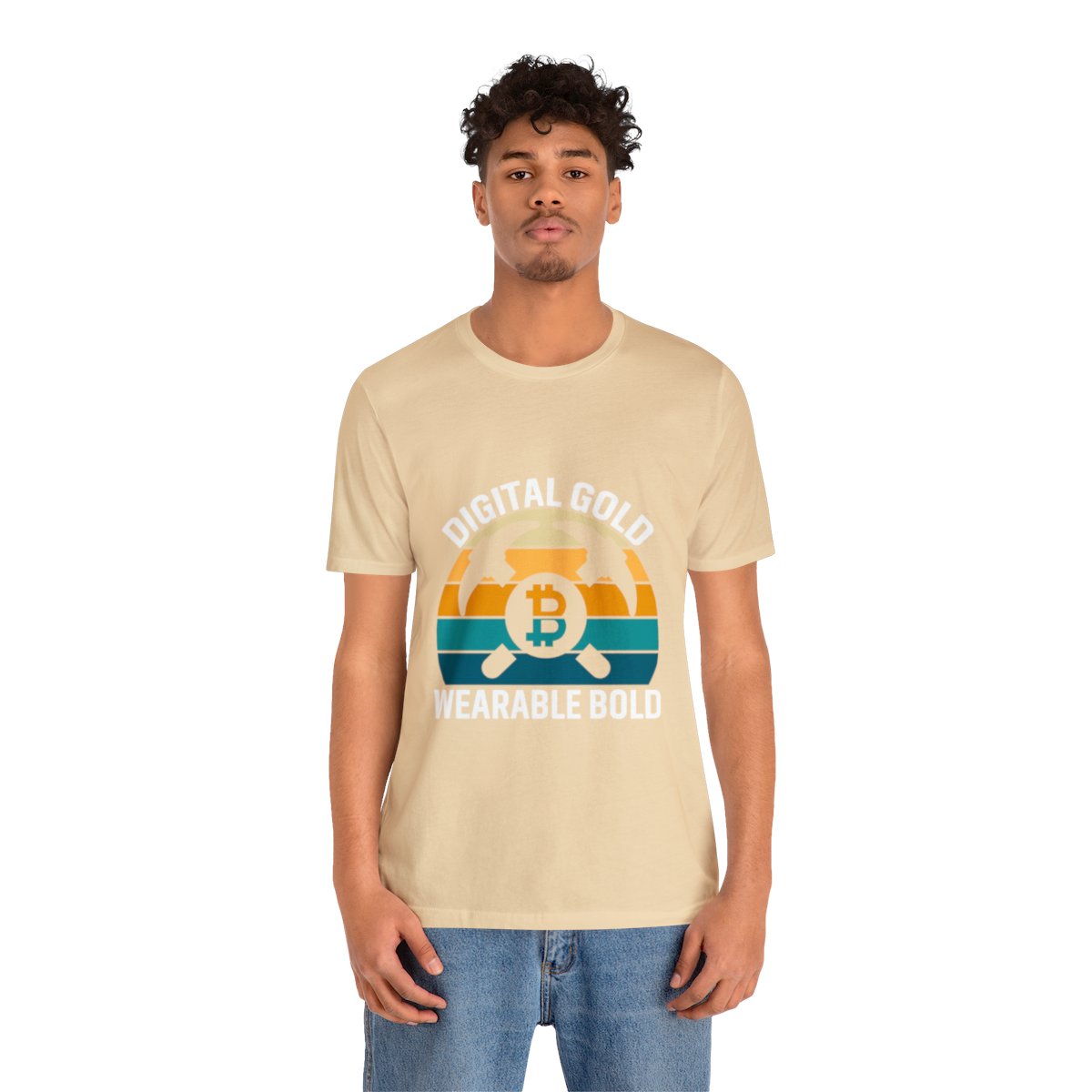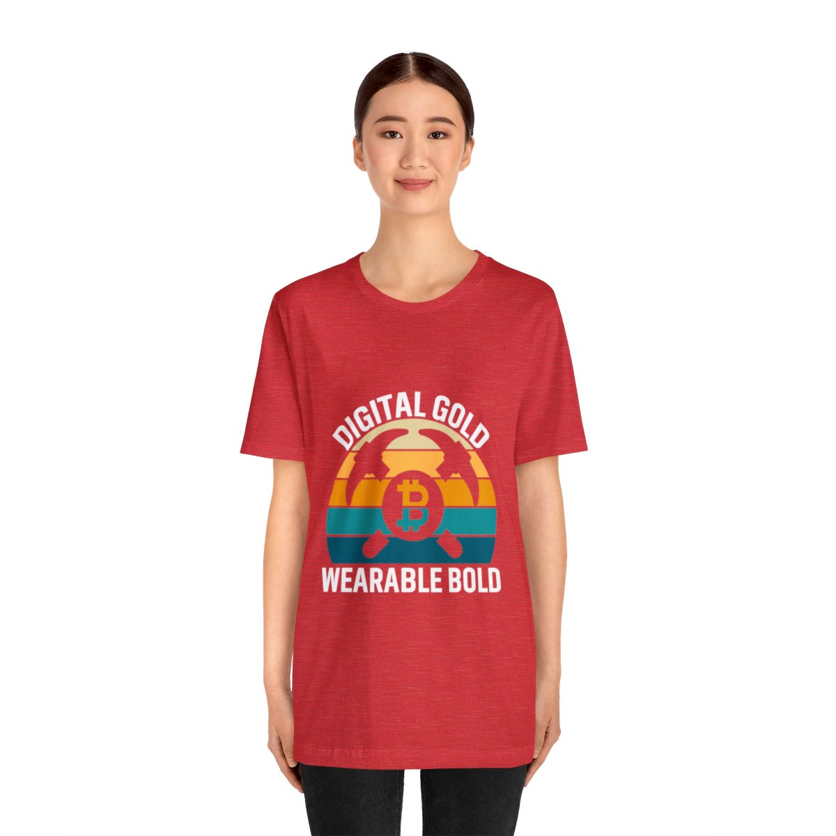 Introducing our “Digital Gold, Wearable Bold” T-shirt – a striking fusion of innovation and style that embodies the essence of cryptocurrency. This classic unisex jersey short sleeve tee isn’t just a garment; it’s a statement, a symbol of the modern era where digital meets bold. Crafted with meticulous attention to detail, this tee fits like a well-loved favorite, offering a luxurious embrace of soft cotton and a quality print that captures hearts over and over again. The ribbed knit collars contribute to shaping and durability, while the tapered shoulders ensure a fit that evolves with time. Dual side seams uphold the garment’s shape, providing enduring wear. Made with 100% Airlume combed and ring-spun cotton, the lightweight fabric (4.2 oz/yd² or 142 g/m²) is not only easy to layer but also breathable, catering to both active and leisure wear. The retail fit strikes a perfect balance for casual and semi-formal settings, complemented by a classic crew neckline that adds a touch of neat style, ideal for accessorizing. The tee proudly showcases the empowering quote “Digital Gold, Wearable Bold,” encapsulating the transformative power and confidence associated with the world of cryptocurrency. The tear-away label ensures a comfortable, irritation-free experience. With fabric blends in Ash, Heather Prism colors, Heather colors, Athletic Heather, and Black Heather, you have a diverse range to match your unique style. Step into the realm of Digital Gold, where comfort meets boldness, and every wear is a nod to the revolutionary spirit of the digital age. Redefine your wardrobe and make a bold statement with this tee – because in the world of cryptocurrency, being bold is the new gold.