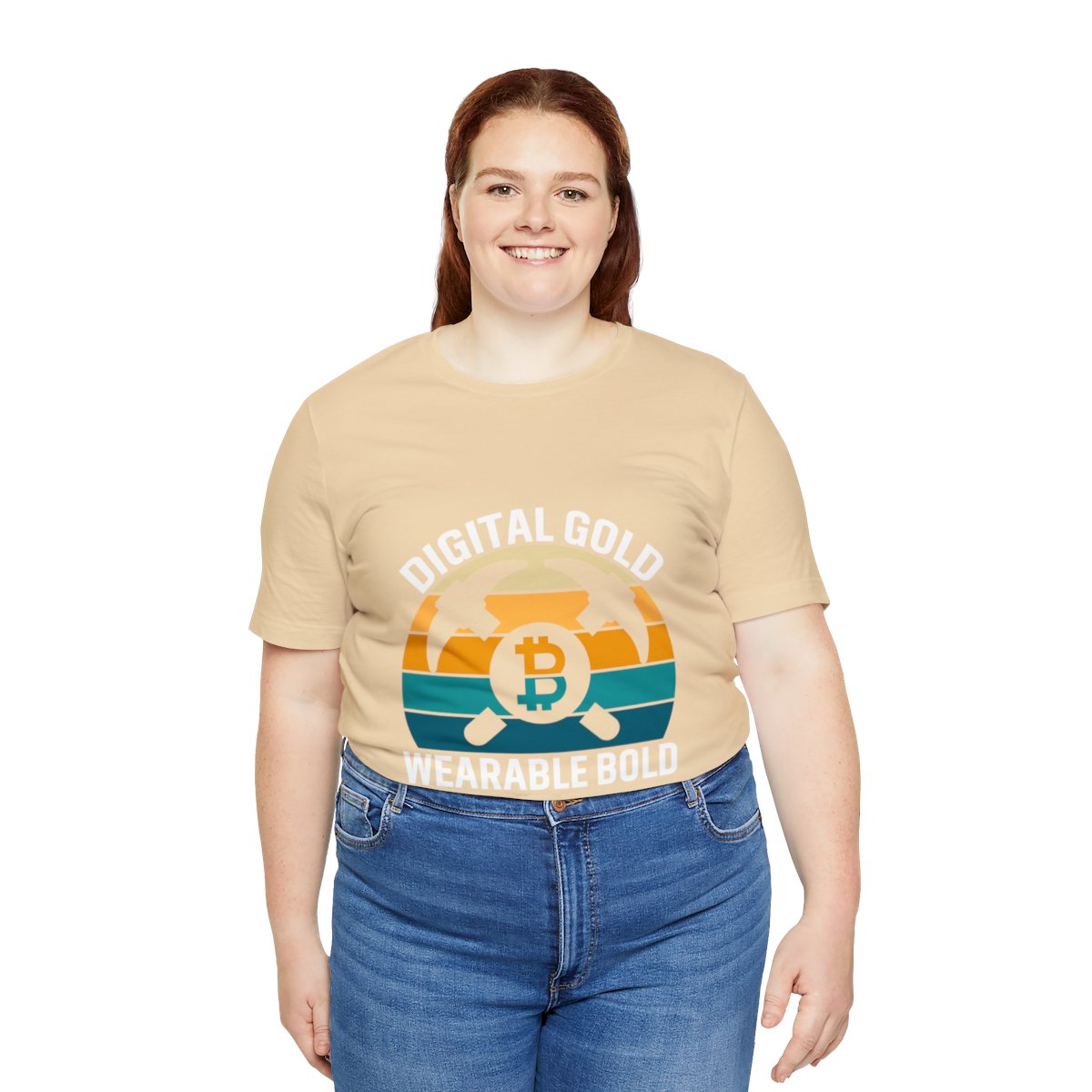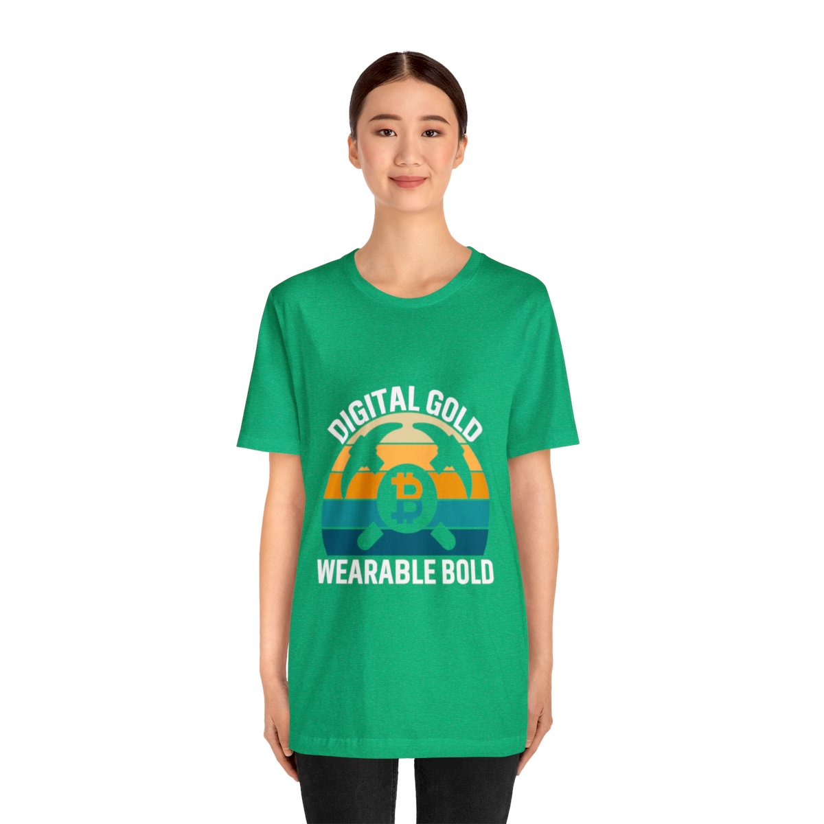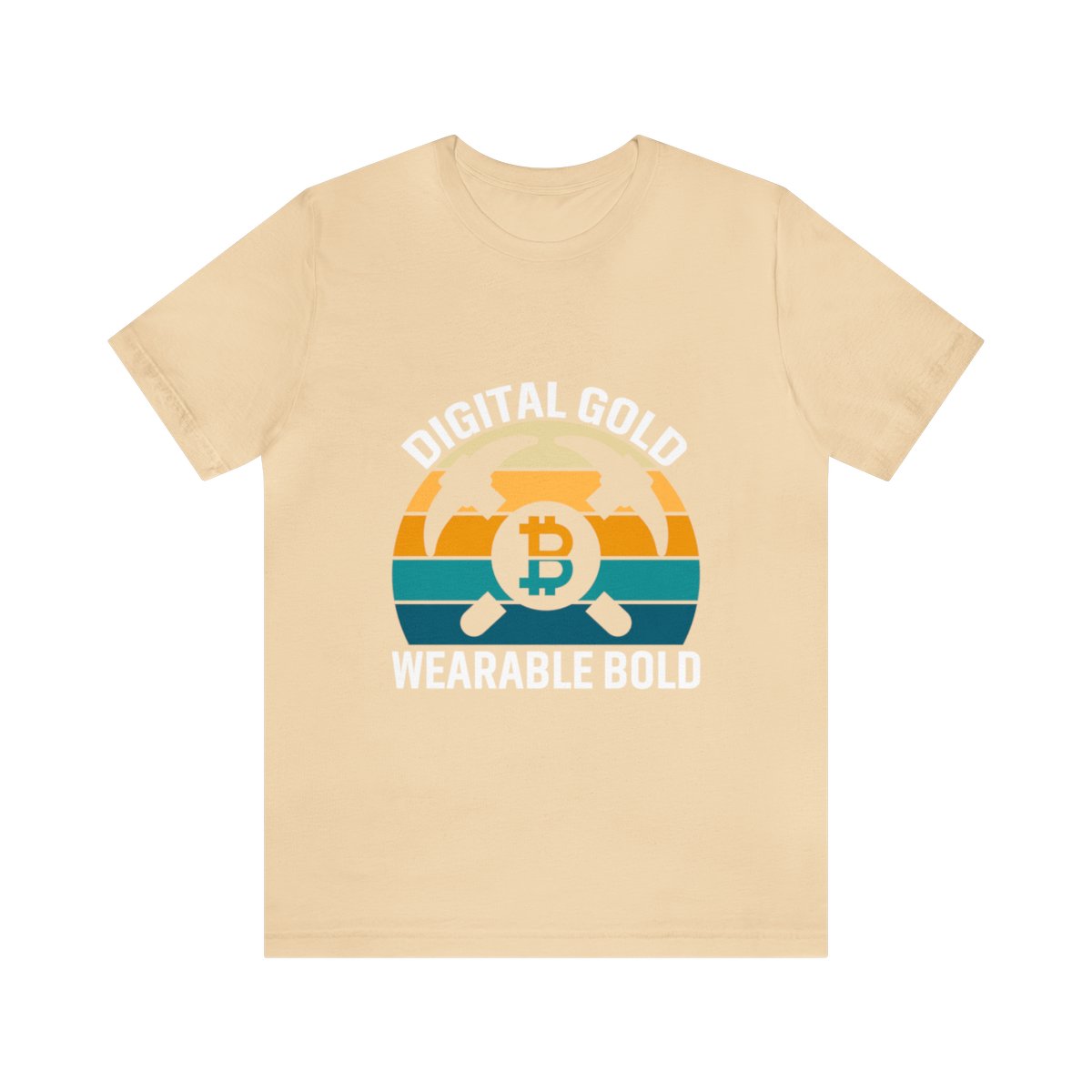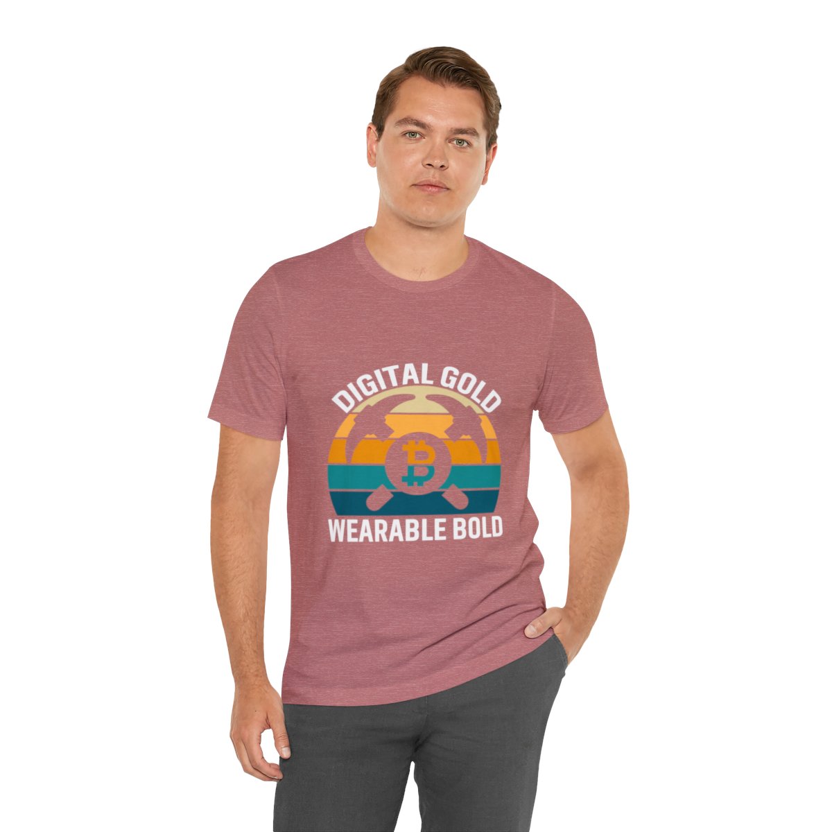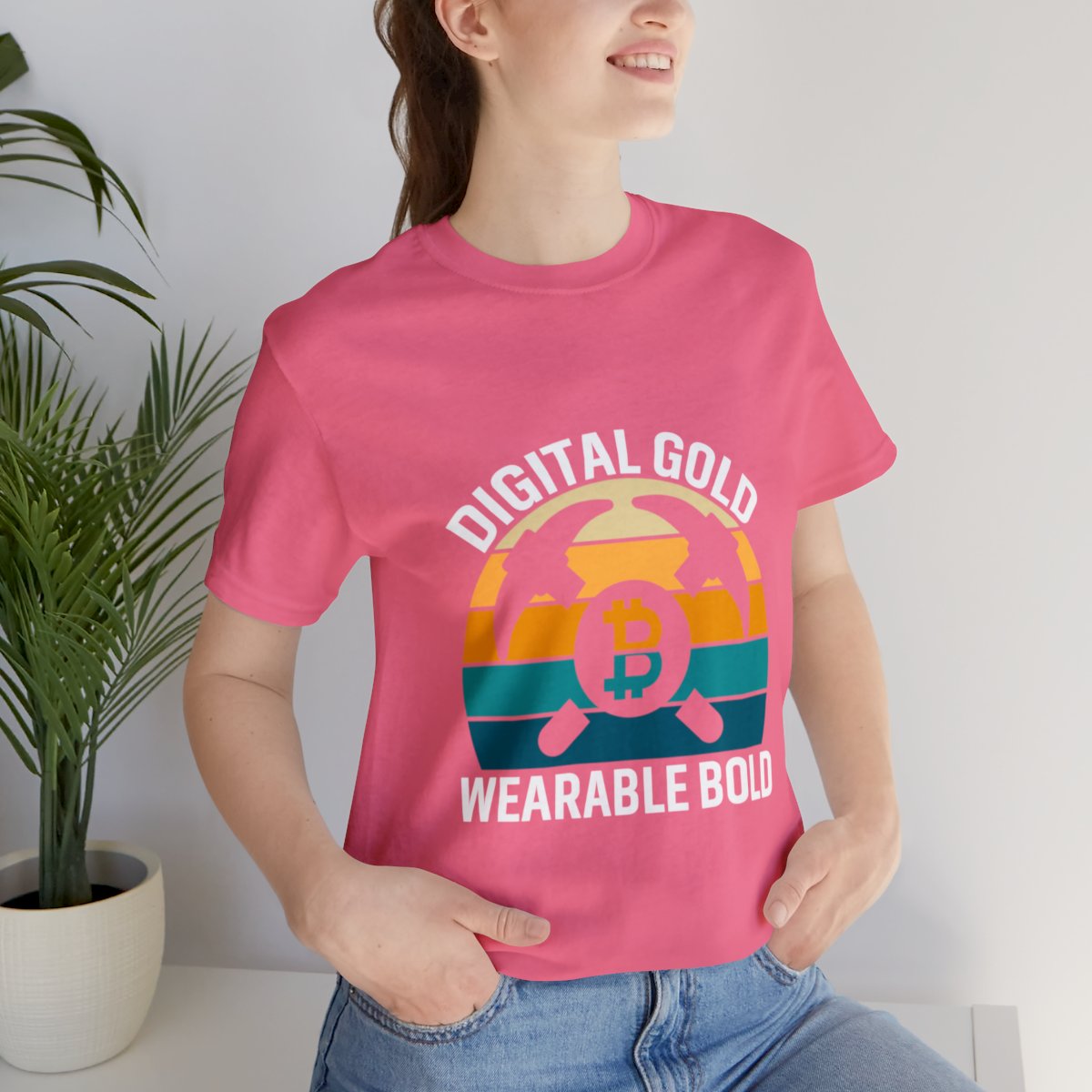 Introducing our “Digital Gold, Wearable Bold” T-shirt – a striking fusion of innovation and style that embodies the essence of cryptocurrency. This classic unisex jersey short sleeve tee isn’t just a garment; it’s a statement, a symbol of the modern era where digital meets bold. Crafted with meticulous attention to detail, this tee fits like a well-loved favorite, offering a luxurious embrace of soft cotton and a quality print that captures hearts over and over again. The ribbed knit collars contribute to shaping and durability, while the tapered shoulders ensure a fit that evolves with time. Dual side seams uphold the garment’s shape, providing enduring wear. Made with 100% Airlume combed and ring-spun cotton, the lightweight fabric (4.2 oz/yd² or 142 g/m²) is not only easy to layer but also breathable, catering to both active and leisure wear. The retail fit strikes a perfect balance for casual and semi-formal settings, complemented by a classic crew neckline that adds a touch of neat style, ideal for accessorizing. The tee proudly showcases the empowering quote “Digital Gold, Wearable Bold,” encapsulating the transformative power and confidence associated with the world of cryptocurrency. The tear-away label ensures a comfortable, irritation-free experience. With fabric blends in Ash, Heather Prism colors, Heather colors, Athletic Heather, and Black Heather, you have a diverse range to match your unique style. Step into the realm of Digital Gold, where comfort meets boldness, and every wear is a nod to the revolutionary spirit of the digital age. Redefine your wardrobe and make a bold statement with this tee – because in the world of cryptocurrency, being bold is the new gold.