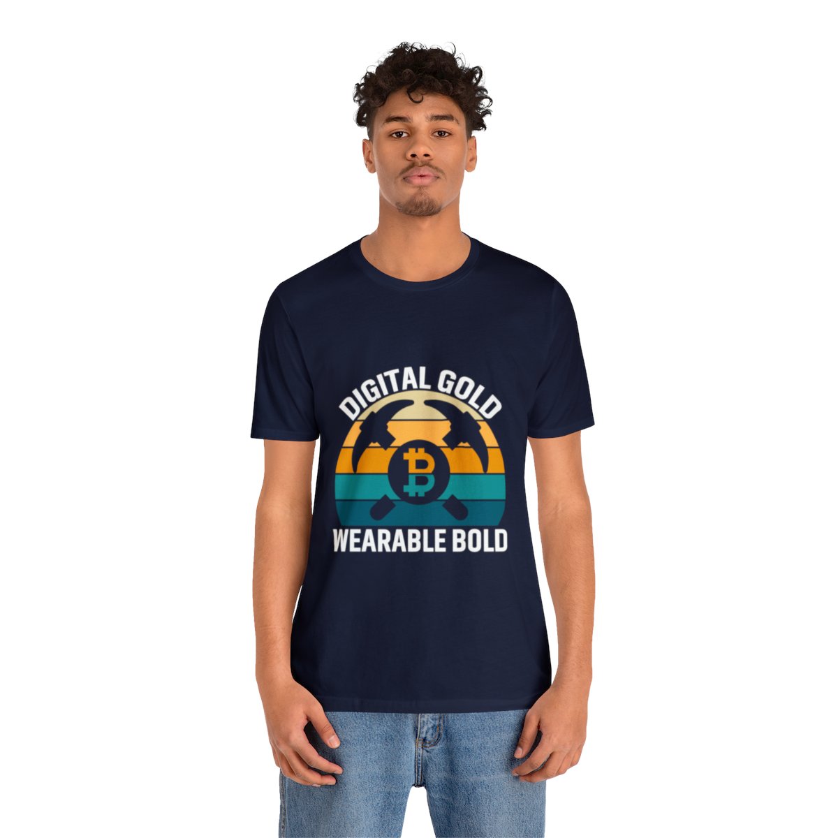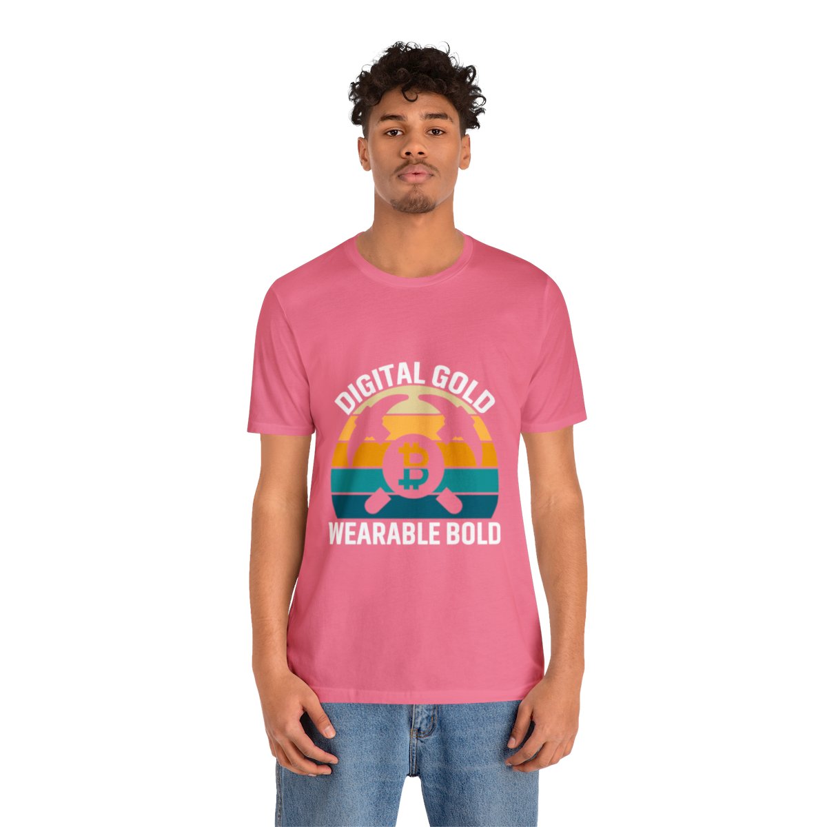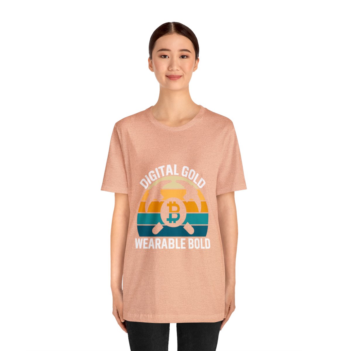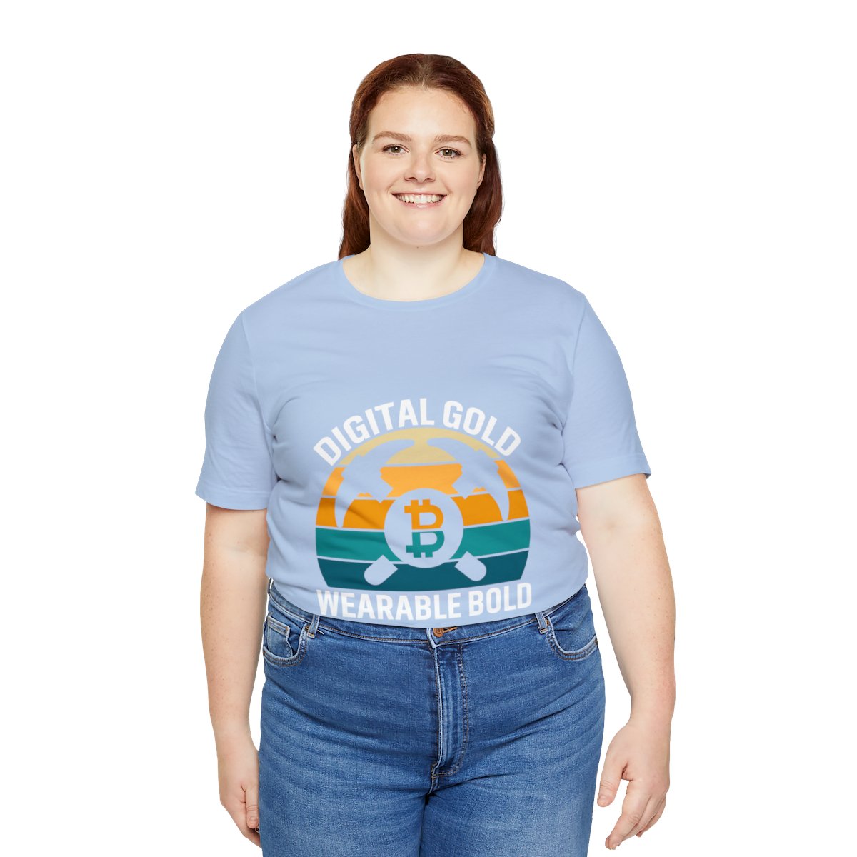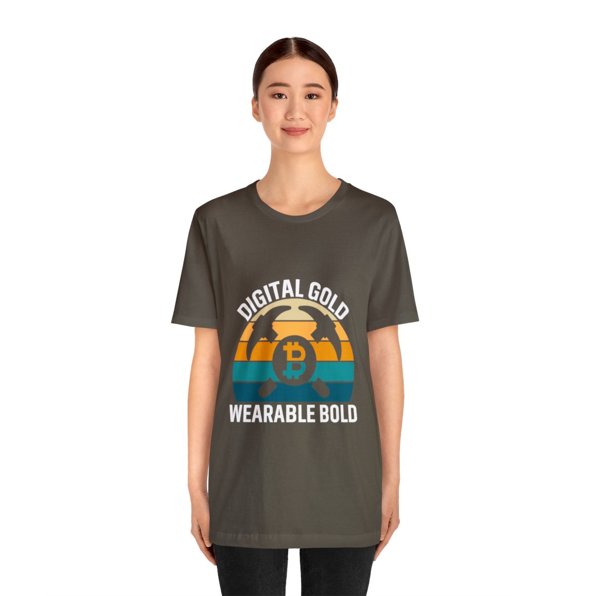 Introducing our “Digital Gold, Wearable Bold” T-shirt – a striking fusion of innovation and style that embodies the essence of cryptocurrency. This classic unisex jersey short sleeve tee isn’t just a garment; it’s a statement, a symbol of the modern era where digital meets bold. Crafted with meticulous attention to detail, this tee fits like a well-loved favorite, offering a luxurious embrace of soft cotton and a quality print that captures hearts over and over again. The ribbed knit collars contribute to shaping and durability, while the tapered shoulders ensure a fit that evolves with time. Dual side seams uphold the garment’s shape, providing enduring wear. Made with 100% Airlume combed and ring-spun cotton, the lightweight fabric (4.2 oz/yd² or 142 g/m²) is not only easy to layer but also breathable, catering to both active and leisure wear. The retail fit strikes a perfect balance for casual and semi-formal settings, complemented by a classic crew neckline that adds a touch of neat style, ideal for accessorizing. The tee proudly showcases the empowering quote “Digital Gold, Wearable Bold,” encapsulating the transformative power and confidence associated with the world of cryptocurrency. The tear-away label ensures a comfortable, irritation-free experience. With fabric blends in Ash, Heather Prism colors, Heather colors, Athletic Heather, and Black Heather, you have a diverse range to match your unique style. Step into the realm of Digital Gold, where comfort meets boldness, and every wear is a nod to the revolutionary spirit of the digital age. Redefine your wardrobe and make a bold statement with this tee – because in the world of cryptocurrency, being bold is the new gold.