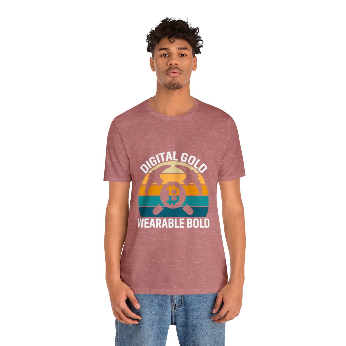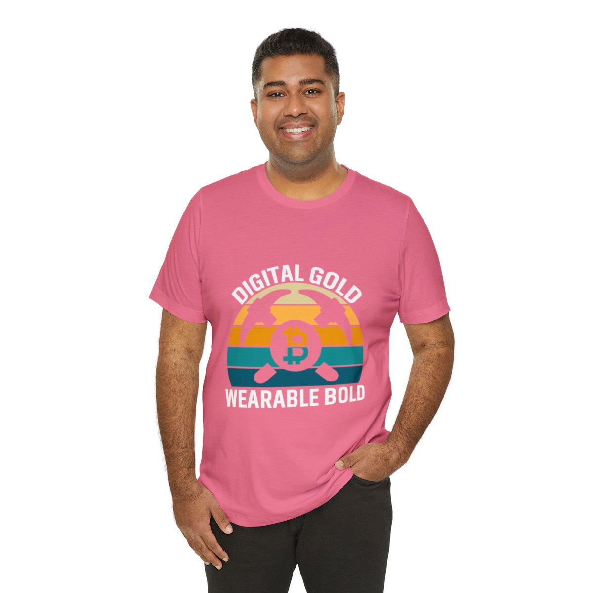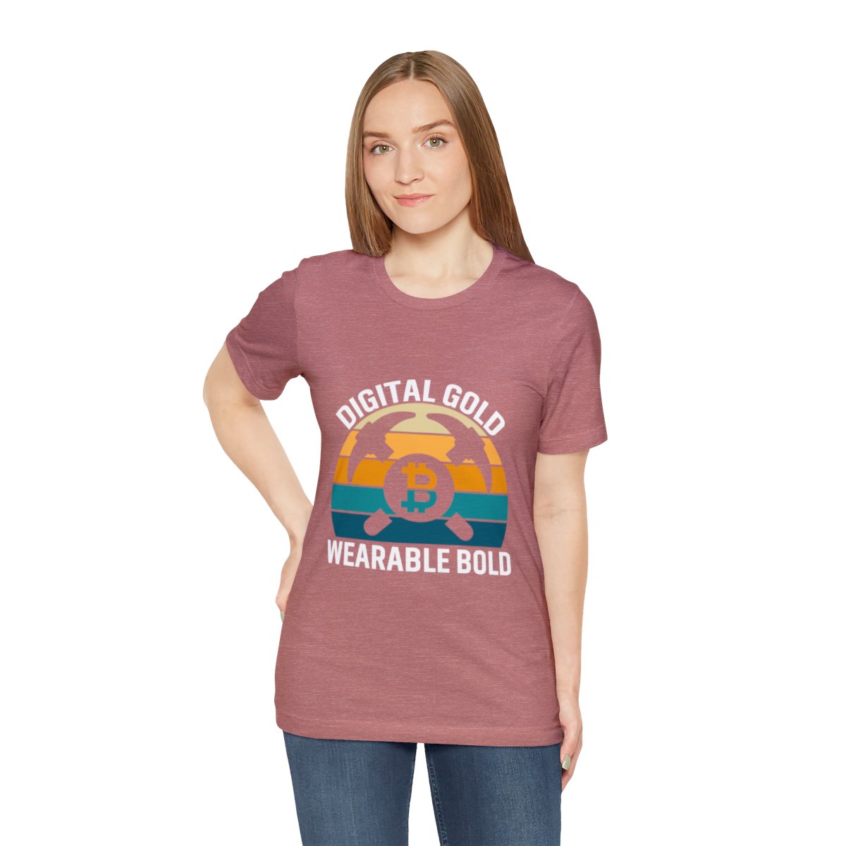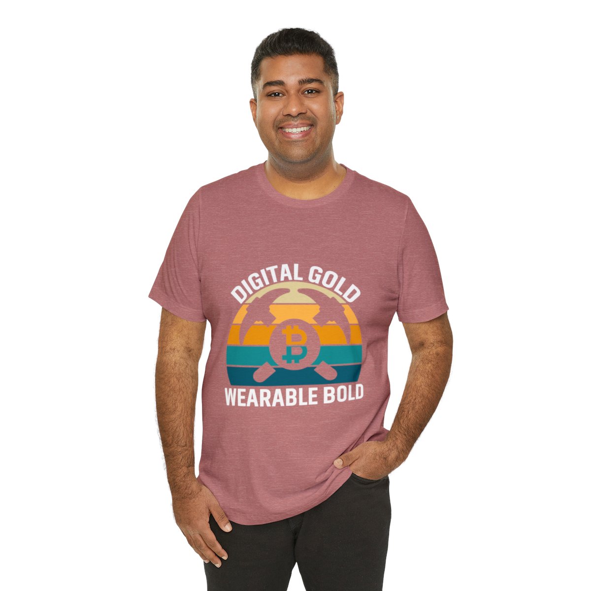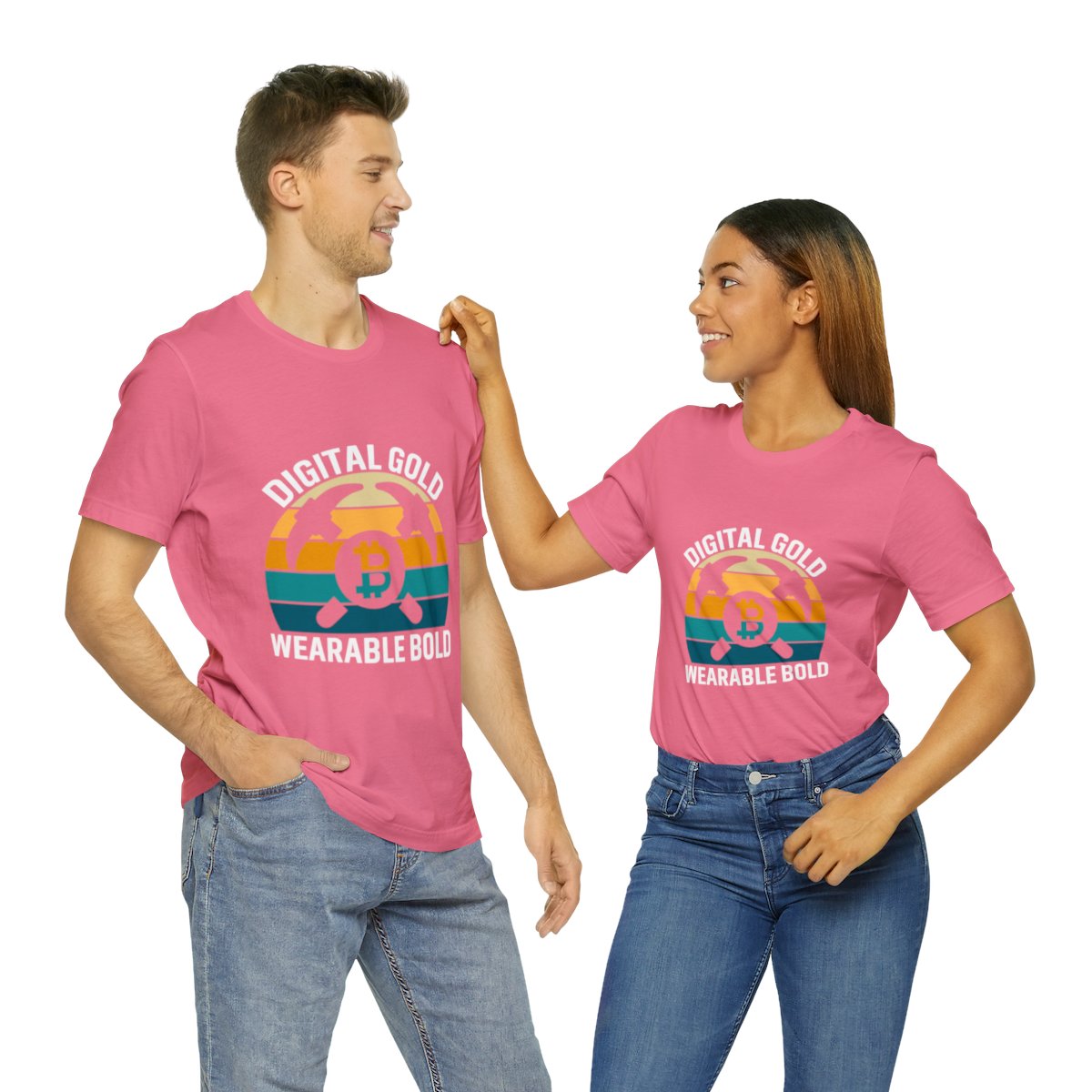 Introducing our “Digital Gold, Wearable Bold” T-shirt – a striking fusion of innovation and style that embodies the essence of cryptocurrency. This classic unisex jersey short sleeve tee isn’t just a garment; it’s a statement, a symbol of the modern era where digital meets bold. Crafted with meticulous attention to detail, this tee fits like a well-loved favorite, offering a luxurious embrace of soft cotton and a quality print that captures hearts over and over again. The ribbed knit collars contribute to shaping and durability, while the tapered shoulders ensure a fit that evolves with time. Dual side seams uphold the garment’s shape, providing enduring wear. Made with 100% Airlume combed and ring-spun cotton, the lightweight fabric (4.2 oz/yd² or 142 g/m²) is not only easy to layer but also breathable, catering to both active and leisure wear. The retail fit strikes a perfect balance for casual and semi-formal settings, complemented by a classic crew neckline that adds a touch of neat style, ideal for accessorizing. The tee proudly showcases the empowering quote “Digital Gold, Wearable Bold,” encapsulating the transformative power and confidence associated with the world of cryptocurrency. The tear-away label ensures a comfortable, irritation-free experience. With fabric blends in Ash, Heather Prism colors, Heather colors, Athletic Heather, and Black Heather, you have a diverse range to match your unique style. Step into the realm of Digital Gold, where comfort meets boldness, and every wear is a nod to the revolutionary spirit of the digital age. Redefine your wardrobe and make a bold statement with this tee – because in the world of cryptocurrency, being bold is the new gold.