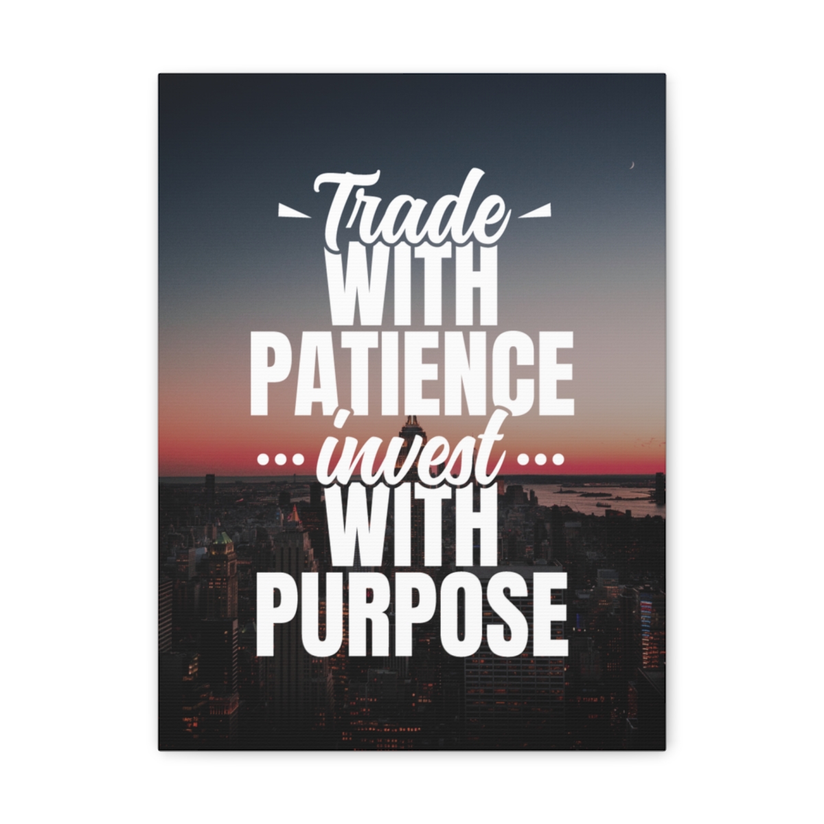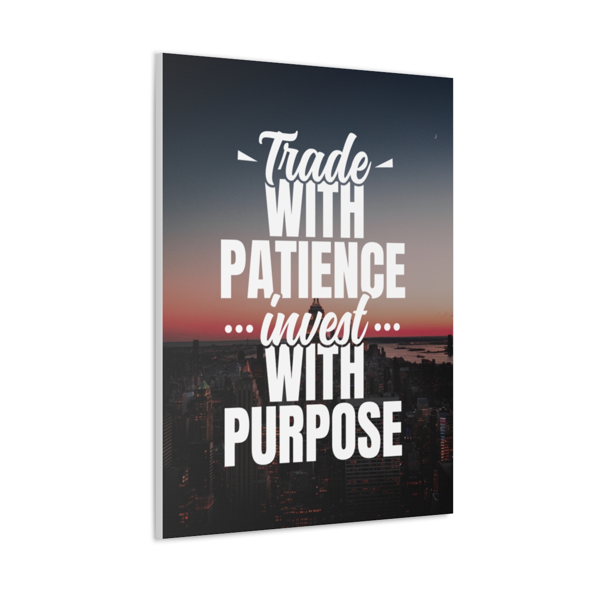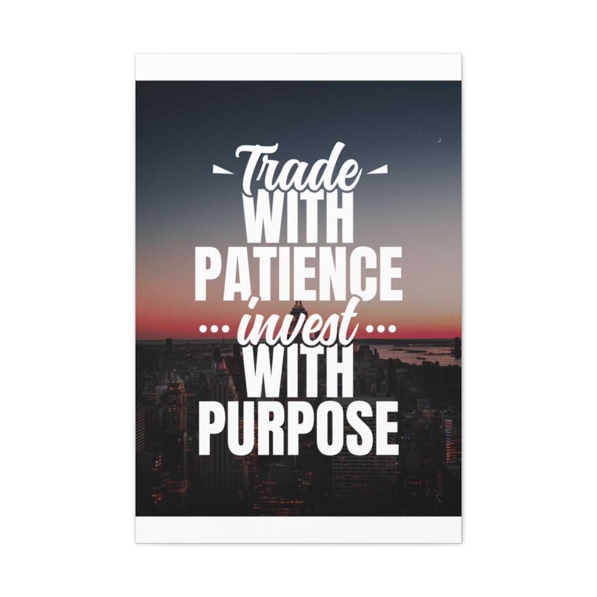 Introducing our exclusive canvas collection – where wisdom meets artistry. Elevate your space with purpose and patience, embodied in the insightful quote: “Trade with patience, invest with purpose.” Our canvas wraps are meticulously crafted to uplift any room’s decor, infusing it with a sense of intention and thoughtful action. Each wrap is printed on top-quality canvas gallery wraps, creating a seamless and visually stunning display. Constructed with a finely textured, artist-grade cotton substrate, these wraps ensure your chosen image is reproduced with exceptional clarity and intricate detail. Available in multiple sizes, these closed-back canvases are not just decorative pieces; they are a representation of strategic thinking and purposeful investing. The patented solid support face provides a robust foundation for your artwork, making these canvases an excellent choice for indoor use. The 100% cotton fabric serves as the perfect medium, allowing for the printing of highly-detailed and vibrant artwork that resonates with every observer. With a thickness of 0.0135 inches (13.5 mil) and weighing 400gsm, these canvases offer a highly durable option, ensuring your prints remain visually stunning for the long run. The closed MDF backing adds an extra layer of protection, preserving the longevity and integrity of your cherished prints. Please note that these canvases are specifically designed for indoor use, ensuring they maintain their beauty and meaningful message for years to come. Transform your space into a haven of purposeful living. Choose our canvas wraps and let your walls inspire you to trade with patience and invest with purpose – because in every decision, there is an opportunity for growth.