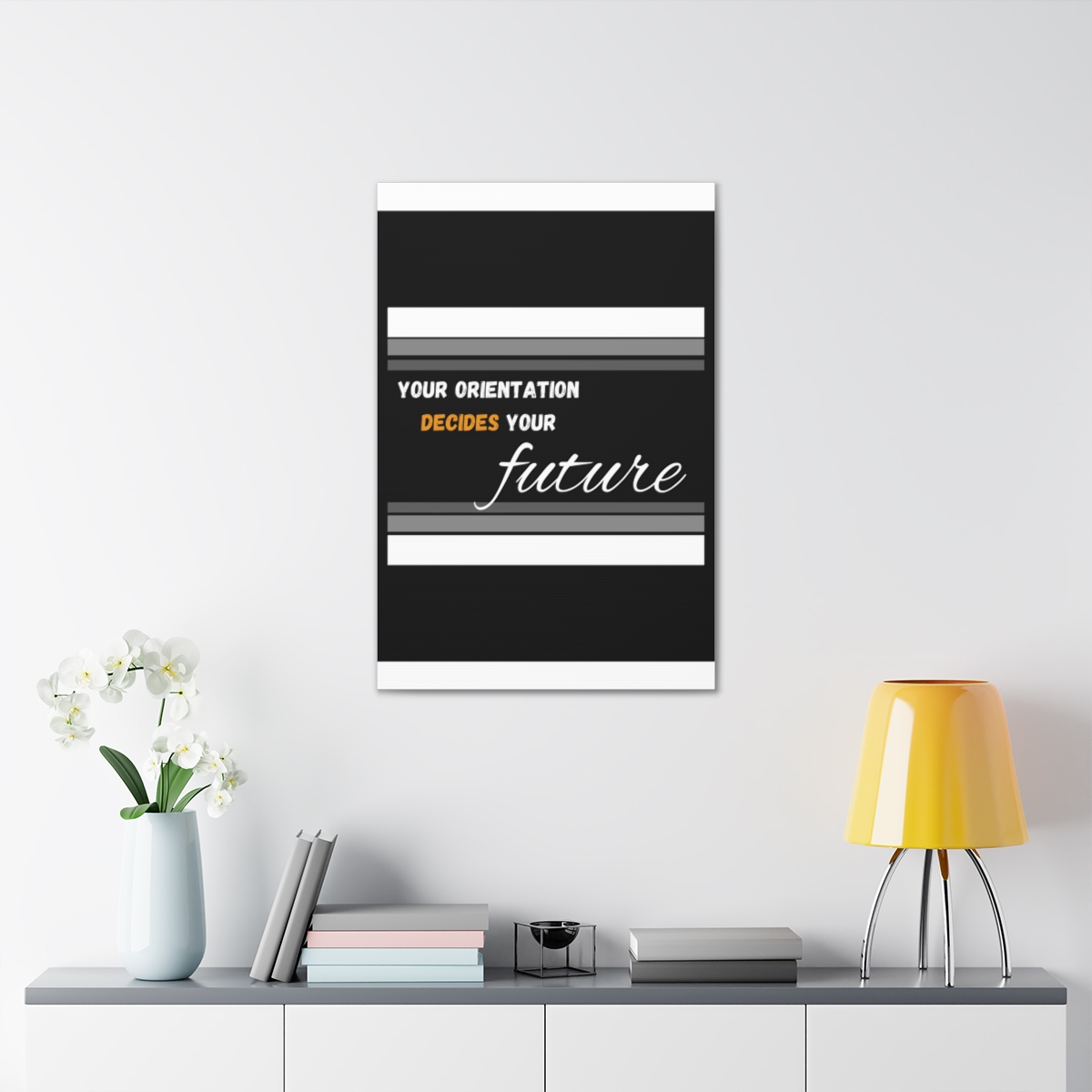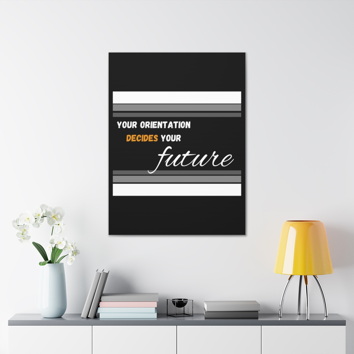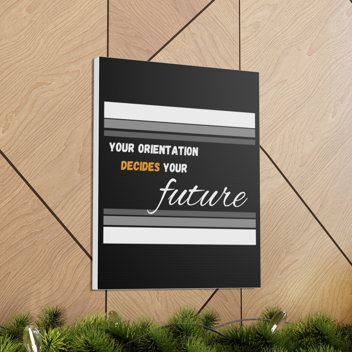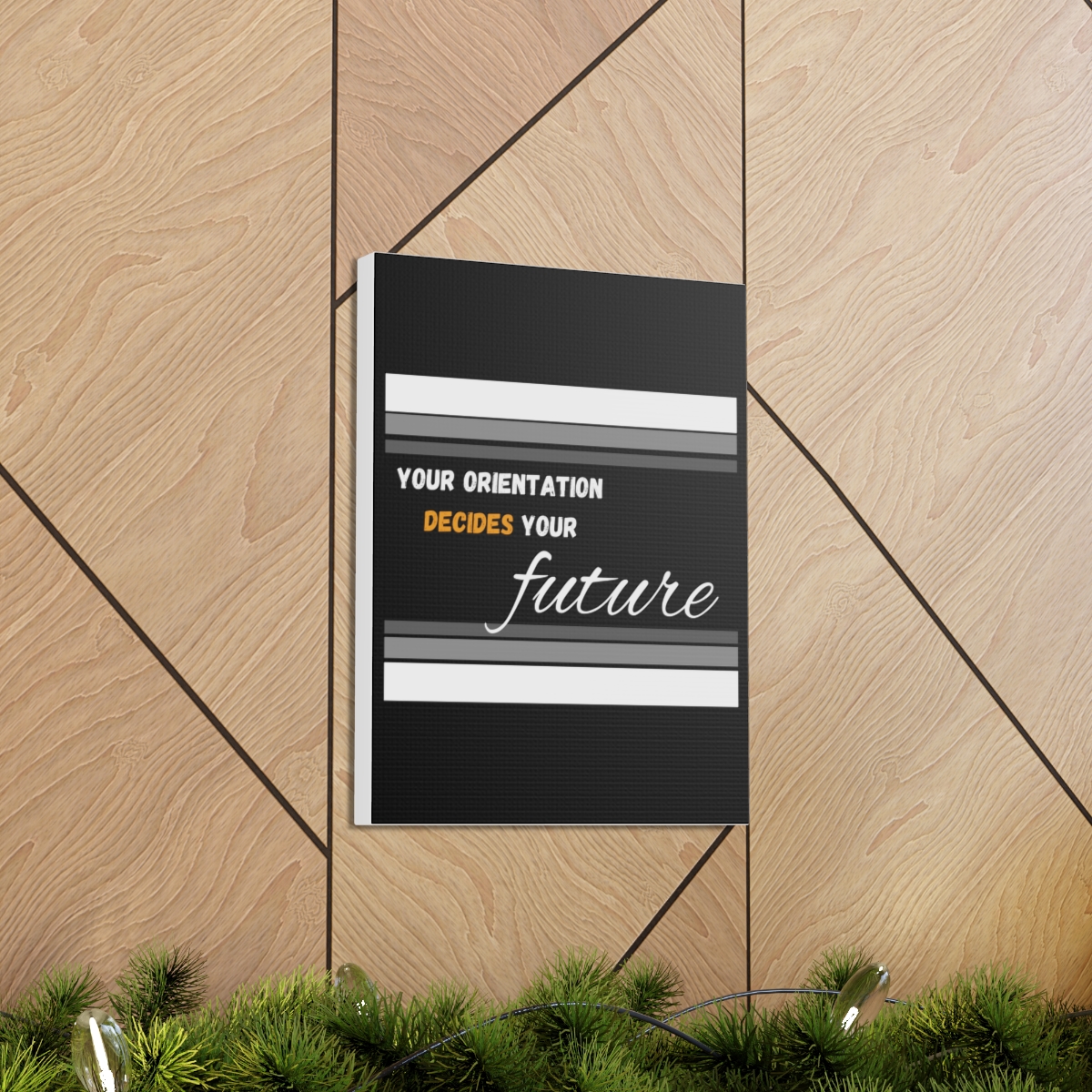 Introducing our empowering canvas collection – where inspiration meets artistry. Transform your space with a touch of motivation and wisdom, embodied in the quote: “Your Orientation decides your Future.” Our canvas wraps are crafted with the utmost care to uplift any room’s decor, infusing it with a blend of elegance and motivational energy. Each wrap is printed on top-quality canvas gallery wraps, creating a seamless and visually captivating display. The wraps are meticulously constructed with a finely textured, artist-grade cotton substrate that ensures your chosen image is reproduced with outstanding clarity and intricate detail. Available in multiple sizes, these closed-back canvases are not just a decoration but a testament to resilience and endurance. The patented solid support face provides a sturdy foundation for your artwork, making these canvases an excellent choice for indoor use. The 100% cotton fabric serves as the perfect medium, allowing for the printing of highly-detailed and vibrant artwork that resonates with every observer. With a thickness of 0.0135 inches (13.5 mil) and weighing 400gsm, these canvases offer a highly durable option, ensuring that your prints remain stunning for the long run. The closed MDF backing adds an extra layer of protection, ensuring the longevity and integrity of your cherished prints. Please note that these canvases are designed for indoor use only, ensuring they retain their beauty and motivational message for years to come. Elevate your surroundings, invest in inspiration. Choose our canvas wraps and let your walls tell a story that encourages and motivates.